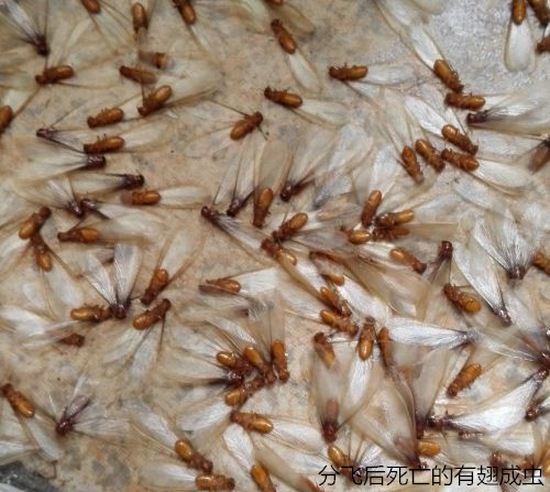 或有翅型:體軀骨化,黃、褐或黑色,有兩對發達的翅。每年4-6月是其分飛高峰期,特別是在春夏雨后悶熱時,大量長翅繁殖蟻從蟻巢中飛出,在離巢不遠處的建筑物附近低飛,飛行時間很短,這種現象稱為婚飛或群飛(分群)。群蟻在低空飛舞,好像在開舞會,各自毫無拘束地自由選擇對象。"情投意合者"飛落地面,各自脫掉翅膀,雌雄成雙追逐,通常為雌前雄后,完成"婚配"大事。配對后的雌雄成蟲經一段時間后,便開始尋找合適場所,建筑新巢"定居"。入穴后,雄蟲常用口器舔舐雌蟲的腹部,有時雌雄蟲彼此舔舐,然后產卵,繁殖后代,另立新的群體。這對"新婚"的雌雄蟻,就是未來新群體的母蟻和父蟻,也就是新群體中的蟻后和蟻王。大多情況下,這對伴侶終身過著"一夫一妻制"的文明社會生活。但不是婚飛中的所有個體都能成雙建立新群,當它們大量飛出時,常被各種鳥類、捕食性昆蟲或其他動物吃掉,往往只有其中的少數能夠幸存下來,但盡管是少數,也足以維持其種族繁衍,并造成對木質建筑物的危害的了,王后躺在王室中可是專門"生育"的,到一定時期又有成蟲出飛建立新的群體。